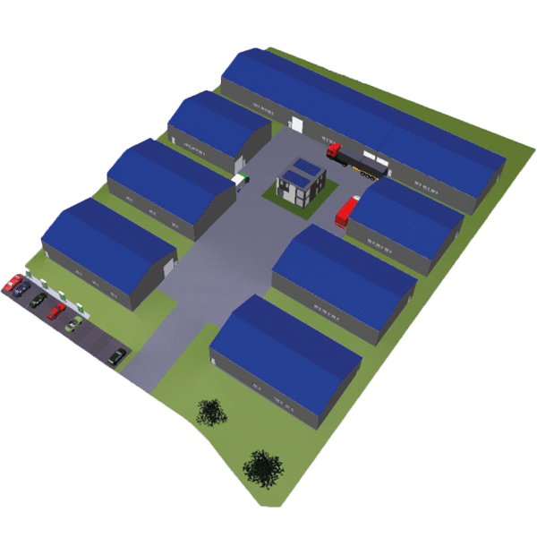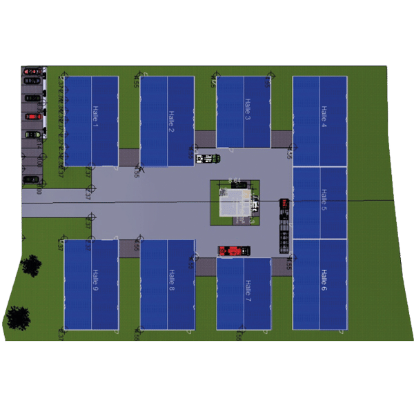 Im Gewerbegebiet entstehen 9 Gewerbehallen mit in Summe 3.164,85 m² Nutzfläche (auch einzeln kaufbar), ein Bürogebäude mit 95,47 m², sowie 28 Stellplätze und 8 E-Ladestationen.